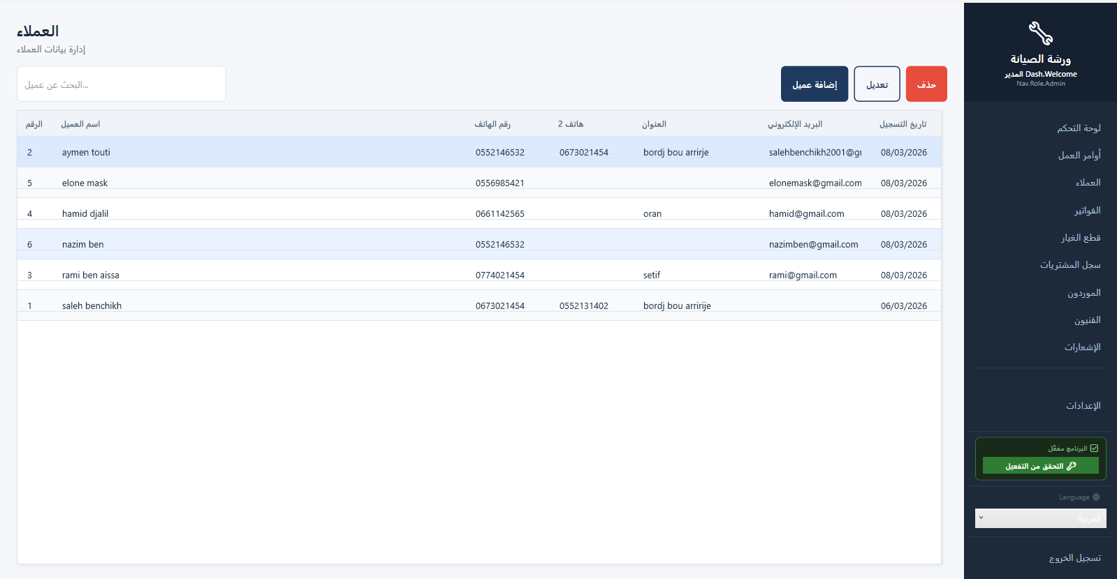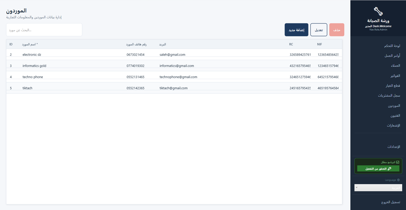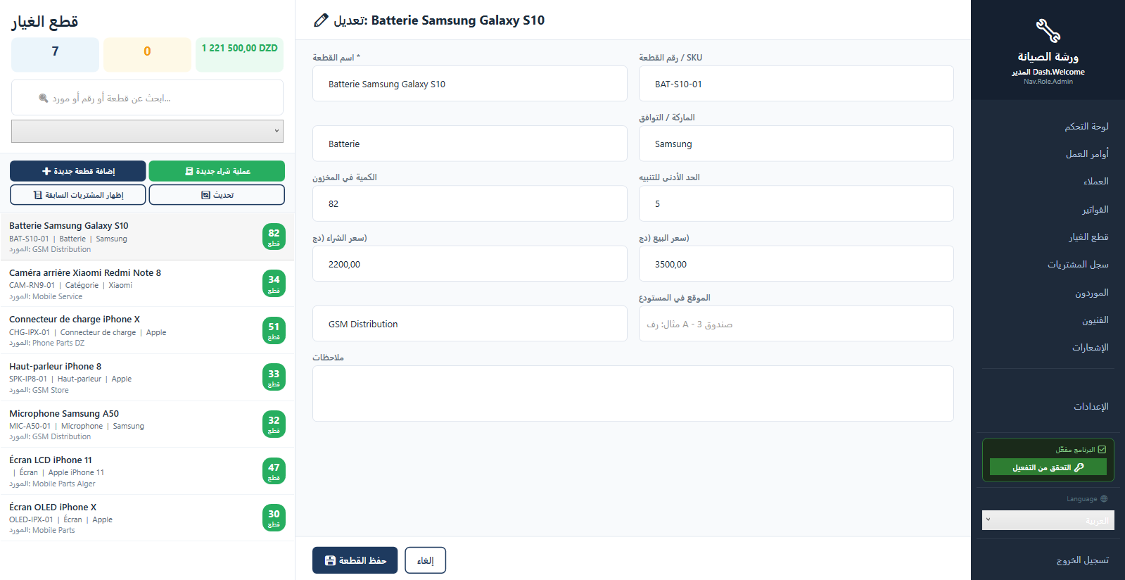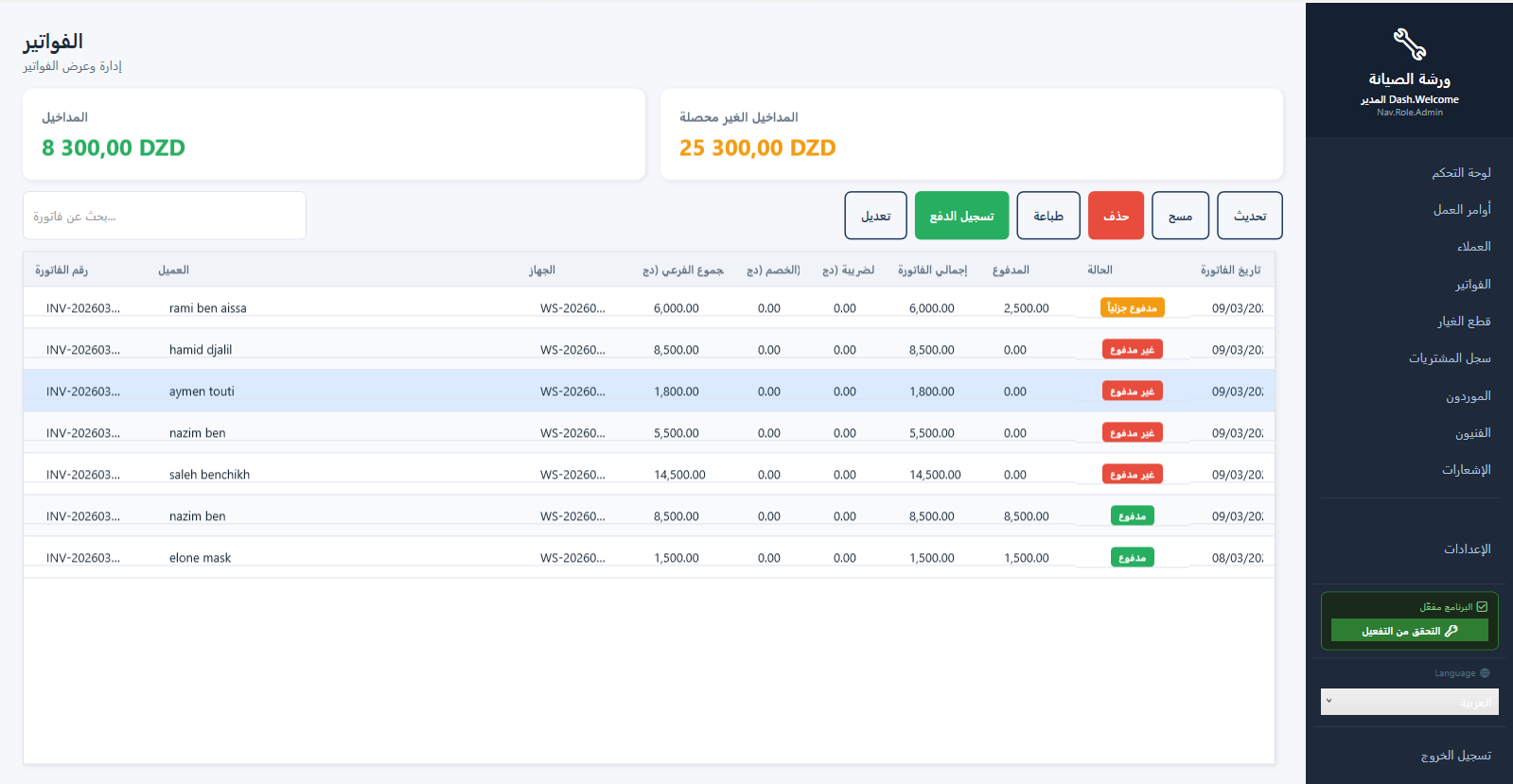 🛠️ برنامج إدارة ورش الصيانة المتكامل (Maintenance Workshop) الحل الأمثل والأسهل لإدارة محلات وورش صيانة الأجهزة (هواتف، حواسيب، إلكترونيات، وغيرها). تحكم كامل في عملك، من استلام الجهاز حتى تسليمه للعميل مع إصدار الفواتير! 🌟 الميزات الأساسية للبرنامج: 1. 📦 استلام وتسليم الأجهزة الذكي: شاشة سريعة لاستلام الأجهزة الجديدة بخطوة واحدة (تسجيل العميل، الجهاز، ووصف العطل). طباعة تذكرة استلام (وصل) فورية للعميل برقم تسلسلي منظم تحتوي على تفاصيل الجهاز وموعد التسليم. تتبع دقيق لحالة الجهاز (قيد الانتظار، جاري الإصلاح، بانتظار قطع غيار، مكتمل، تم التسليم). 2. 👥 إدارة العملاء الاحترافية: قاعدة بيانات كاملة لعملائك (الاسم، أرقام الهواتف، العناوين). سجل كامل لكل عميل يوضح الأجهزة التي قام بإصلاحها سابقاً وإجمالي المبالغ المدفوعة. إمكانية البحث السريع عن أي عميل عند استلام جهاز جديد لتجنب تكرار البيانات. 3. ⚙️ إدارة أوامر العمل والفنيين: ربط كل جهاز بـ "أمر عمل" يوضح التكلفة (تكلفة اليد العاملة + تكلفة قطع الغيار). إسناد الأجهزة لفنيين محددين داخل الورشة. متابعة أداء كل فني، ومعرفة الأجهزة التي أنجزها، وحساب نسبة العمولة (Commission) الخاصة به تلقائياً. 4. 🛒 إدارة المخزون وقطع الغيار: جرد دقيق لجميع قطع الغيار الموجودة في الورشة (الاسم، التوافق، الكمية، سعر الشراء، سعر البيع). خصم القطع من المخزون تلقائياً بمجرد إضافتها لأي أمر عمل (إصلاح جهاز). نظام التنبيهات الذكي: ينبهك البرنامج تلقائياً عندما توشك كمية قطعة معينة على النفاذ (الحد الأدنى للمخزون). تسجيل فواتير شراء قطع الغيار من الموردين لزيادة رصيد المخزون. 5. 💰 النظام المالي والفواتير: إصدار فواتير احترافية للعملاء بضغطة زر. دعم للمدفوعات الجزئية (دفع جزء مبدئي "عربون" وبقاء جزء متبقٍ). تتبع الفواتير (مدفوعة، غير مدفوعة، مدفوعة جزئياً). 6. 📊 التقارير والإحصائيات الشاملة: لوحة تحكم (Dashboard) تفاعلية تعطيك نظرة عامة لورشتك (إجمالي الإيرادات، الأجهزة المكتملة، الأجهزة المتأخرة). تقارير مالية دقيقة للإيرادات والأرباح خلال أي فترة زمنية. تقارير الأداء لمعرفة الأعطال الأكثر شيوعاً أو قطع الغيار الأكثر استهلاكاً. 7. 🔔 مركز الإشعارات والتنبيهات: تنبيهات تلقائية للأجهزة التي تأخر إصلاحها عن موعد التسليم المتفق عليه مع العميل. تنبيهات بنواقص المخزون لتقوم بشرائها في الوقت المناسب. 8. 🛡️ أمان البيانات والنسخ الاحتياطي (Backup): نظام صلاحيات المستخدمين: إنشاء حسابات للموظفين بصلاحيات محدودة (مثلاً: الفني لا يرى أرباح المحل، المدير يرى كل شيء). خاصية النسخ الاحتياطي بضغطة زر لحماية بيانات ورشتك من التلف والاسترجاع في أي وقت. 9. 🎨 تخصيص البرنامج باسم محلك: إمكانية إضافة (اسم الورشة، الشعار Logo، أرقام الهواتف، العنوان) لتظهر بشكل أنيق ورسمي على جميع الفواتير وإيصالات الاستلام. 10. 🌍 ثنائي اللغة (عربي / فرنسي): واجهة مستخدم عصرية وسهلة الاستخدام، تدعم التبديل الفوري بين اللغتين العربية والفرنسية بضغطة زر لتناسب بيئة عملك. 🔥 لماذا يفضل أصحاب الورش هذا البرنامج؟ ✅ يعمل أوفلاين 100%: لا يحتاج إلى إنترنت إطلاقاً، جميع بيانات عملائك وأموالك محفوظة بأمان تام على جهازك الشخصي. ✅ نسخة محمولة خفيفة: نسخة للبيع تعمل كـ ملف واحد فقط (.exe)، لا تتطلب أي تثبيت معقد، تشتغل مباشرة على الويندوز. ✅ سريع جداً وخفيف: يعمل بكفاءة عالية حتى على أجهزة الكمبيوتر القديمة أو الضعيفة. ✅ لا اشتراكات شهرية: (يمكنك بيعه كنسخة مفتوحة الدفع مرة واحدة، أو بنظام تفعيل مفاتيح التراخيص - حسب خطتك التجارية).